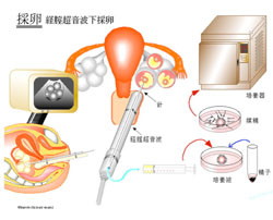 オビドレル投与2日後の朝に採卵を行います。 局所麻酔下か静脈麻酔下(全身麻酔)で、経膣超音波にて卵胞を観察しながら膣の壁から針を刺して卵胞液を吸引し、その中の卵を採取します。 看護師が二人付き、安全に配慮した状態で施術します。当日はご主人に精子をとっていただく必要があります。当日はお昼過ぎに帰宅できます。
