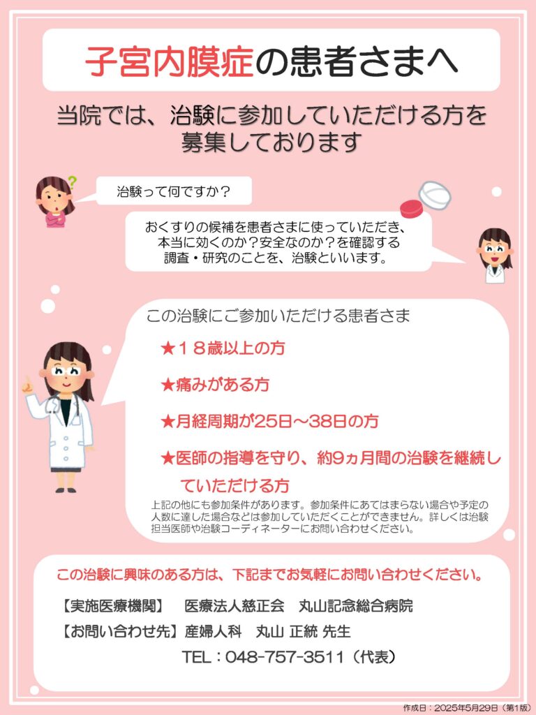 2025.12.23 全般 子宮内膜症による疼痛の強い方へ治験のご案内 子宮内膜症による疼痛の強い方へ治験のご案内です。 この治験にご興味のある方は画像内、「お問い合わせ先」よりお問い合わせください。 奨学金制度 リハビリテーション科 前の記事 eGFR値早見表 次の記事
