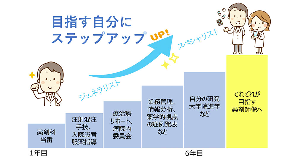 ジェネラリストとして活躍していく中でさらに、産科や癌、終末期などの幅広い医療を通してスペシャリストを目指す薬剤師を育んでいきます。地域の総合病院で働く薬剤師は多くを学び、患者様の治療に参加していくという、とてもやりがいのあるお仕事です。