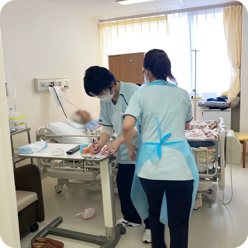 不安の多い1年目はプリセプターが個人に合った指導でしっかりサポートします。定期的な技術チェックや院内での出張研修の実施など、現場での実践による教育を主体とし、充実した現任教育、新人同士の集合研修など精神面のケアを重視した内容で、安心して学べる環境が整っています。院内研修にも自発的に参加できるよう情報提供、勤務調整、研究休暇の考慮、研修費免除などの、教育のバックアップ体制を整え、「学びたい」という意欲をサポートします。