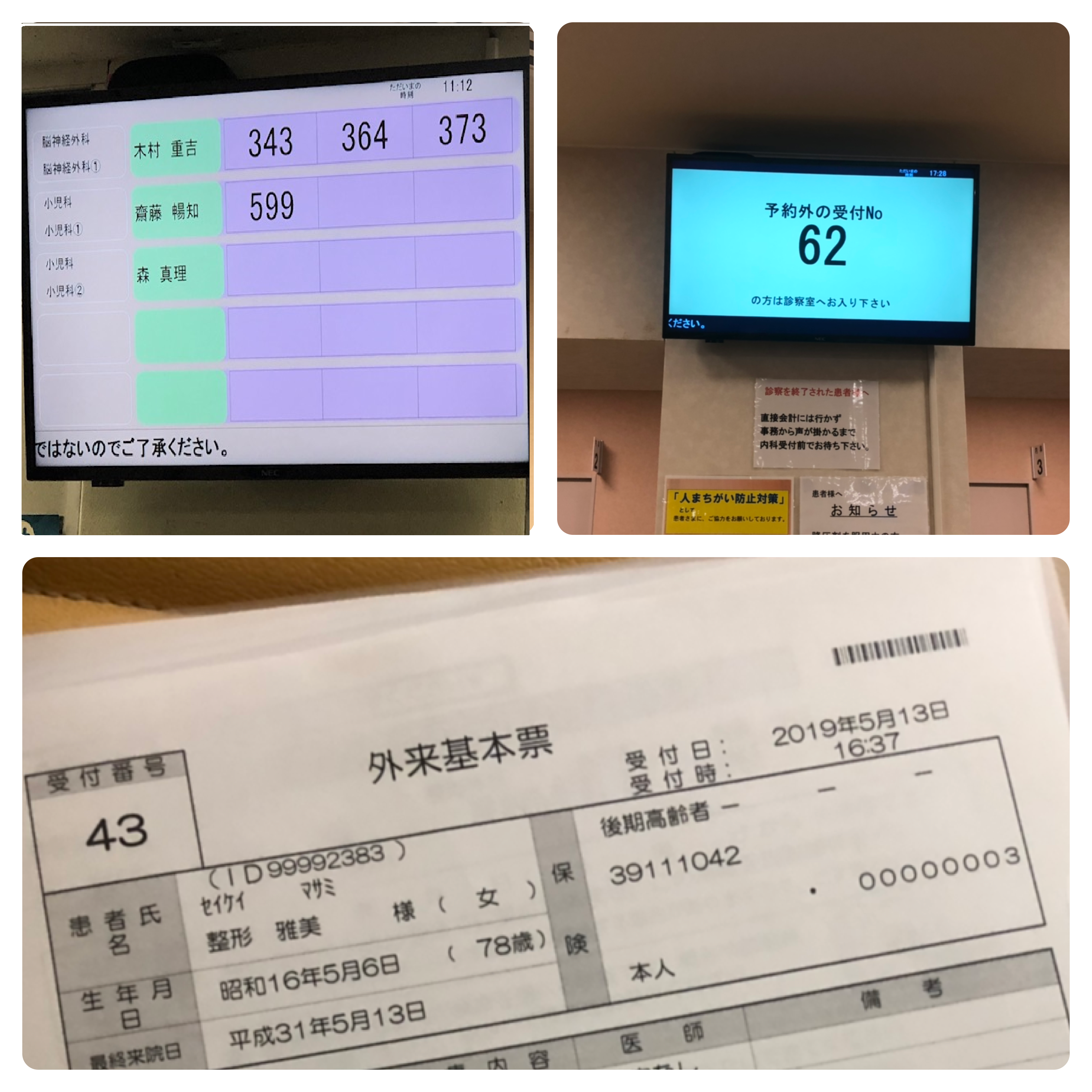 受付が完了しますと、「外来基本票」と「受付票」の2枚の紙が出てきます。「受付票」は、患者様用控えとなっております。なくさないようにお持ちください。受診する診療科の受付へ「外来基本票」が入ったファイルをお出しください。順番待ちディスプレイ画面に番号が表示されます。